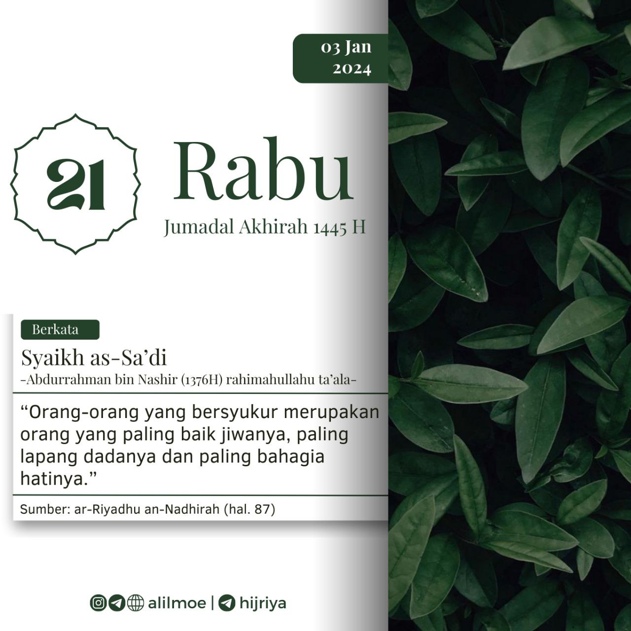 Syaikh Abdurrahman bin Nashir as-Sa‘di (1376H) rahimahullahu ta’ala berkata, الشاكرون أطيب الناس نفوساً، وأشرحهم صـدوراً، وأقــرّهم عيـوناً “Orang-orang yang bersyukur […]