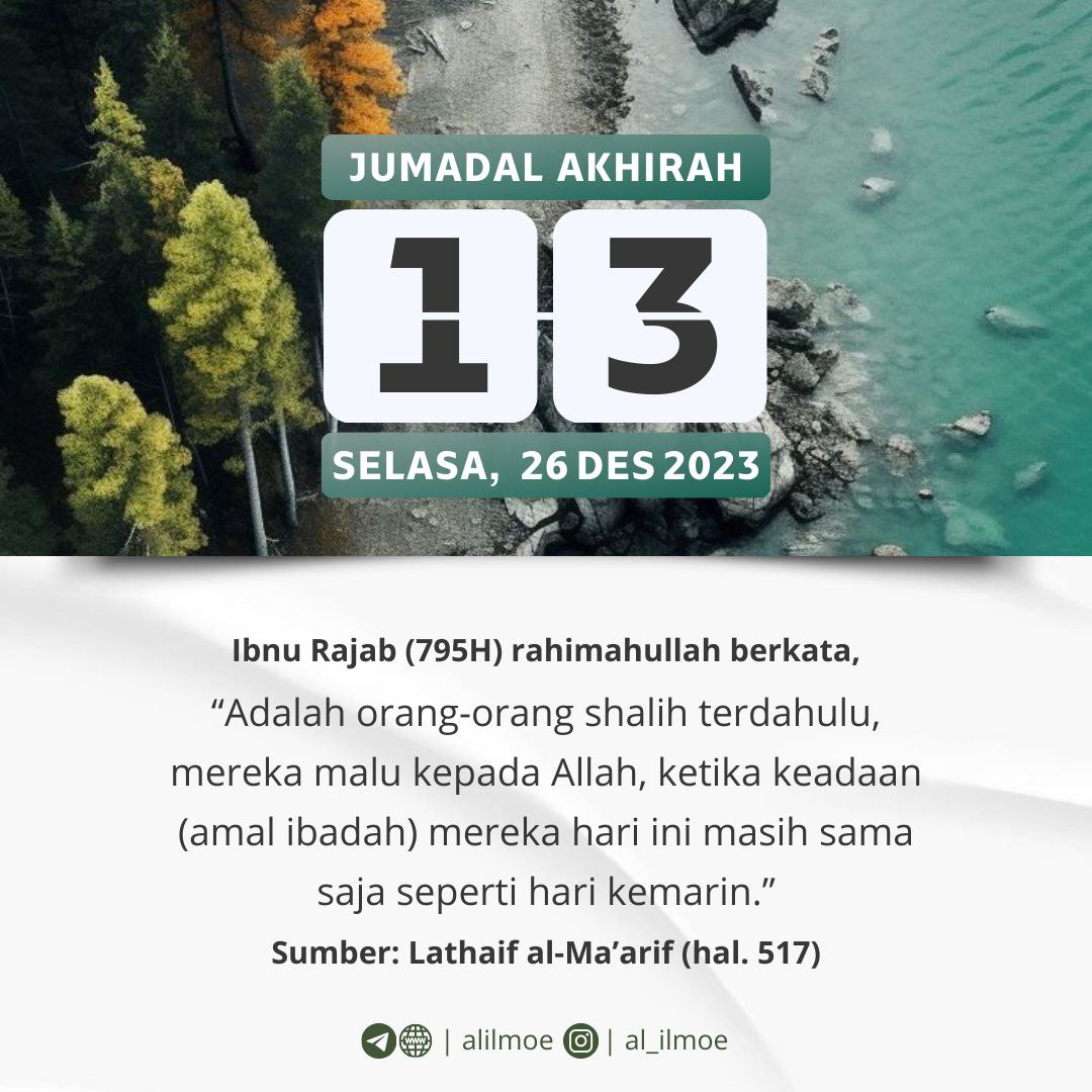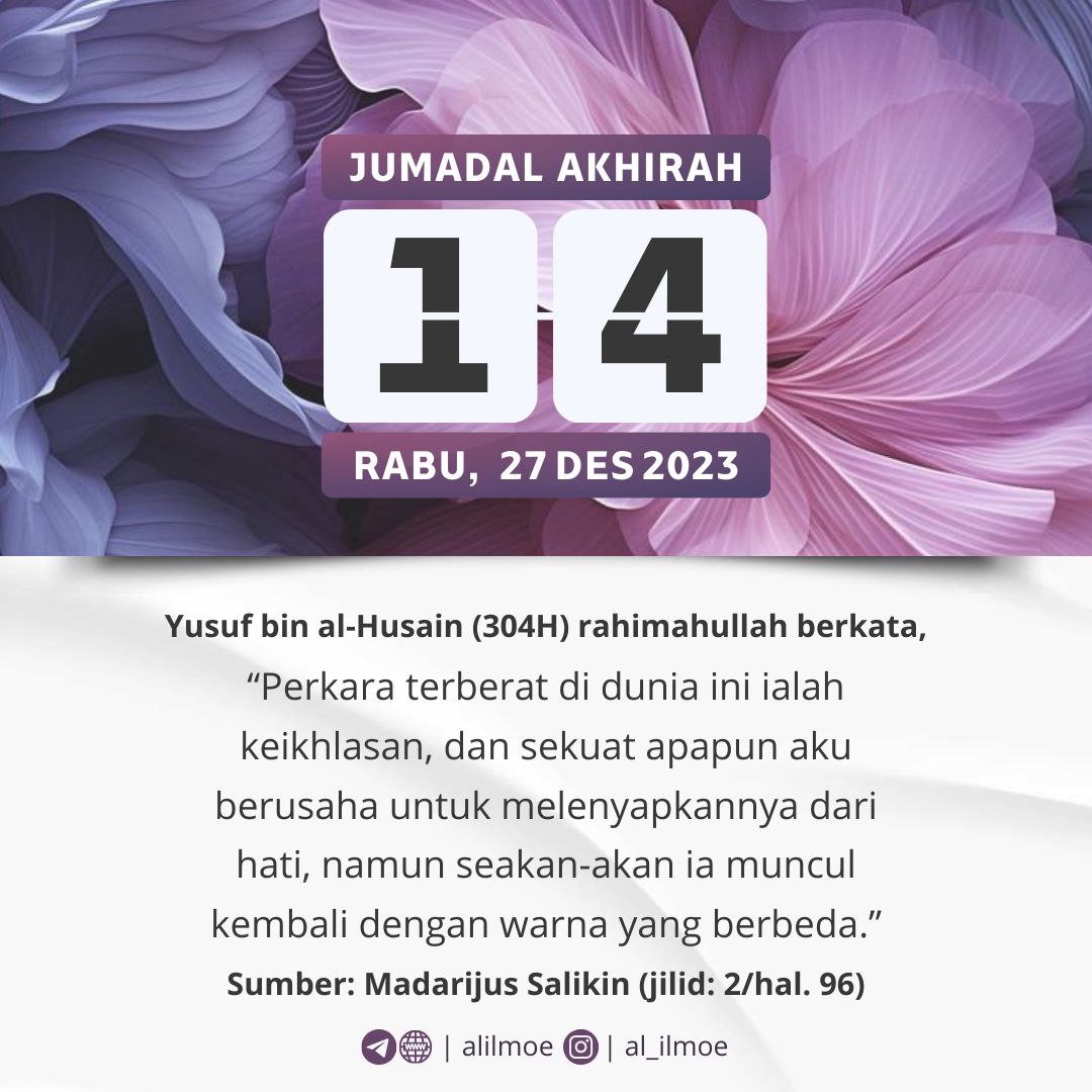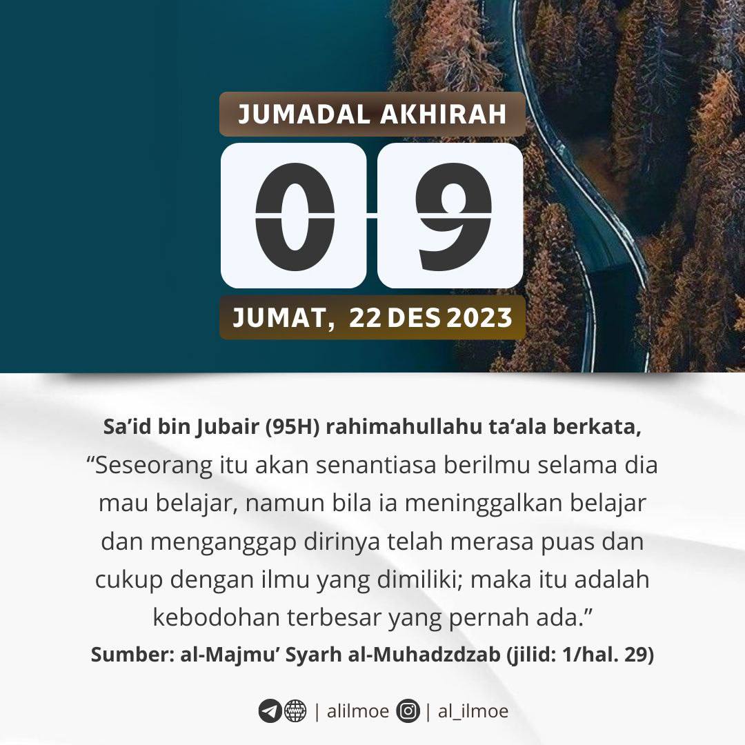 ┏•••🍃✿❁✿🍂•••━━━━━┓JUMAT, 09 JUMADAL AKHIRAH 1445H22 DESEMBER 2023┗━━━━━•••🍂✿❁✿🍃•••┛ MERASA CUKUP DENGAN ILMU ADALAH KEBODOHAN Sa’id bin Jubair (95H) rahimahullahu ta‘ala berkata, […]