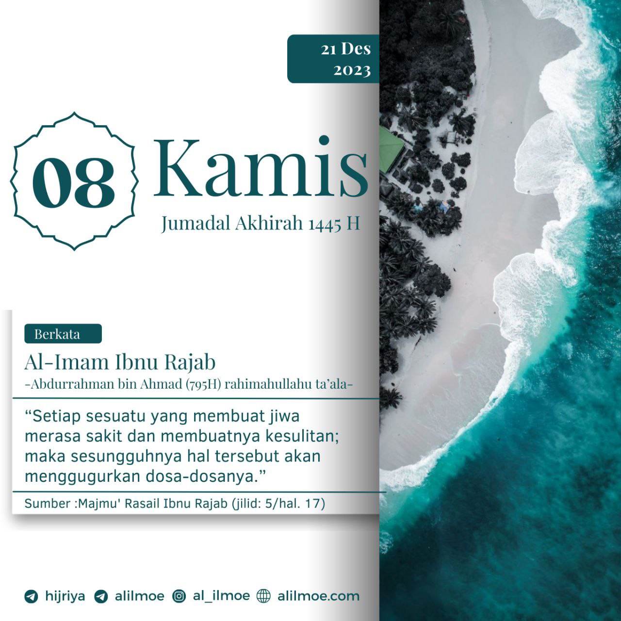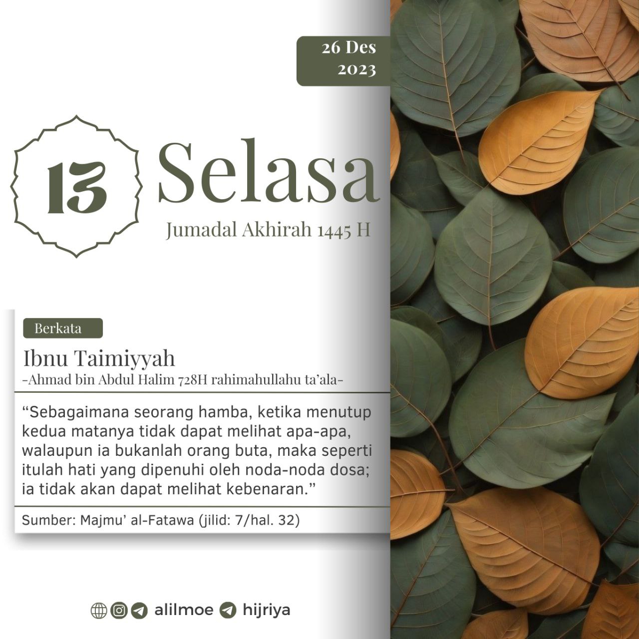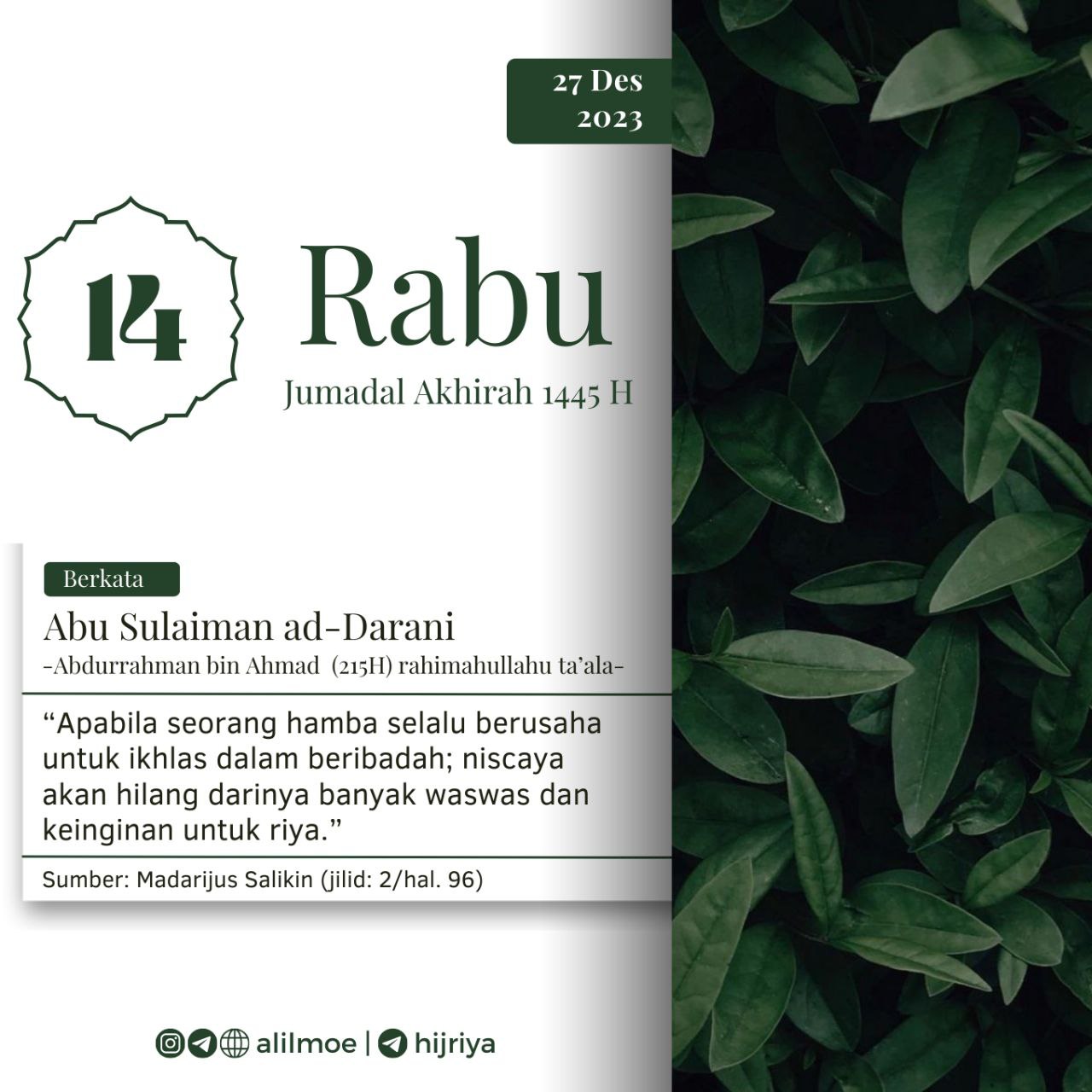 ┏•••🍃✿❁✿🍂•••━━━━━┓KAMIS, 15 JUMADAL AKHIRAH 1445H28 DESEMBER 2023┗━━━━━•••🍂✿❁✿🍃•••┛ Syaikh Muhammad bin Shalih al-‘Utsaimin (1421) rahimahullahu ta’ala berkata, ﺗﺠﺪ ﺃﻛﺜﺮ ﺍﻟﻨﺎﺱ ﻧﻮراً […]