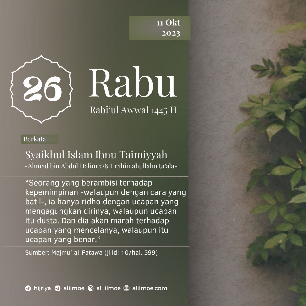 Syaikhul Islam Ibnu Taimiyyah -Ahmad bin Abdul Halim, 728H- rahimahullahu ta’ala berkata, وَطَالِبُ الرِّئَاسَةِ – وَلَوْ بِالْبَاطِلِ – تُرْضِيهِ الْكَلِمَةُ […]