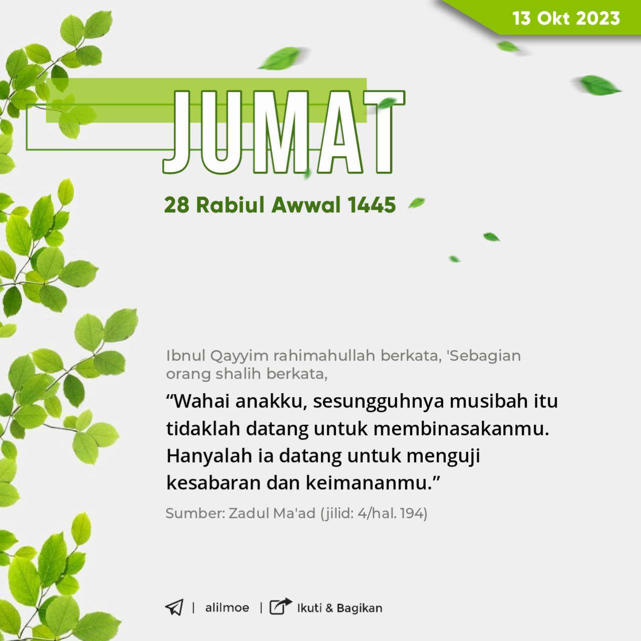 Al-Imam Ibnul Qayyim berkata, ‘Sebagian orang-orang shalih berkata, يا بني إن المصيبة ما جاءت لتهلكك وإنما جاءت لتمتحن صبرك وإيمانك […]