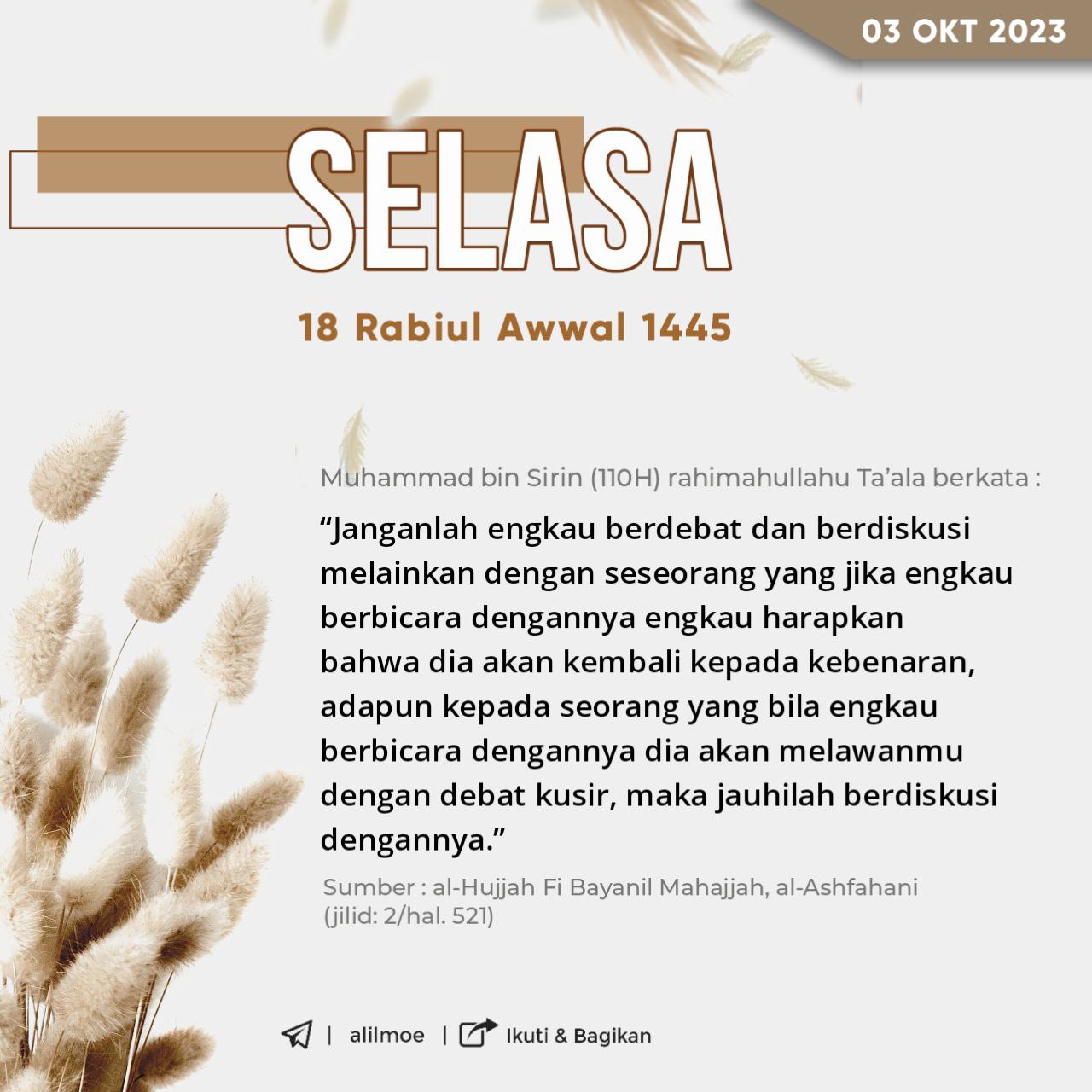 Al-Imam Muhammad bin Sirin (wafat 110H) rahimahullahu ta’ala berkata, لا تجادل إلا رجلا إن كلّمته رجوتَ أن يَرجع، فأمّا من […]