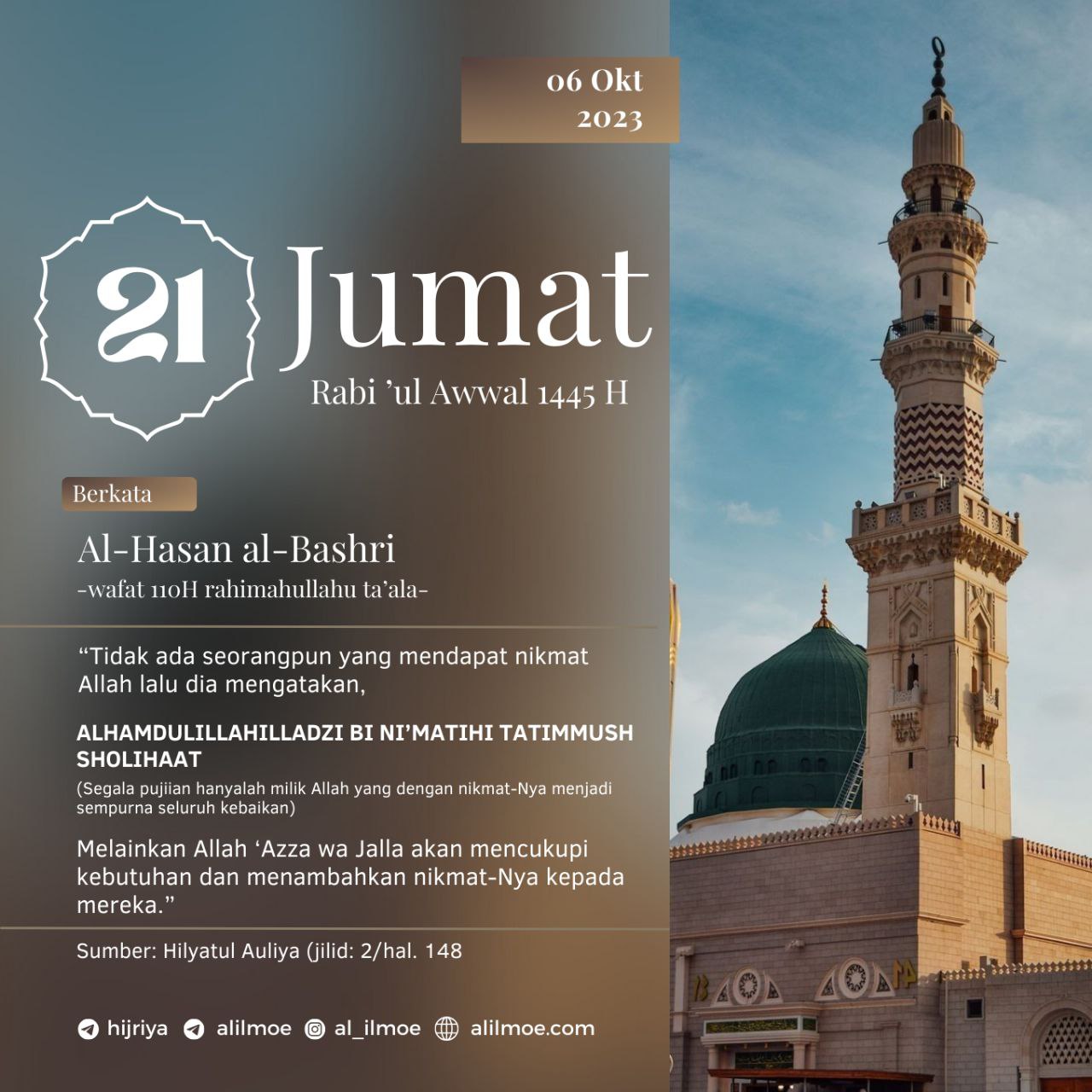 Al-Hasan al-Bashri -wafat 110H- rahimahullahu Ta’ala berkata, ما من رجلٍ يرى نعمة الله عليه؛ فيقول: الحمد لله الذي بنعمته تتِمُّ […]