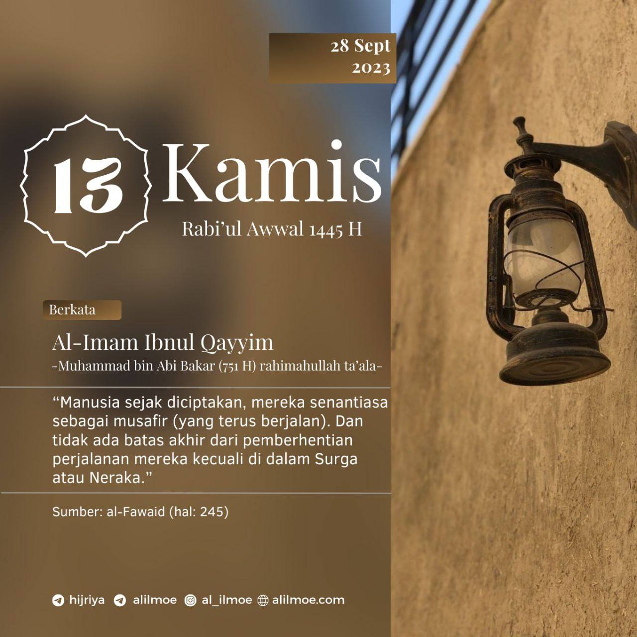 Al-Imam Ibnul Qayyim -Muhammad bin Abi Bakar, wafat 751 H- rahimahullahu ta’ala berkata, فالناس منذ خلقوا لم يزالوا مسافرين, وليس […]