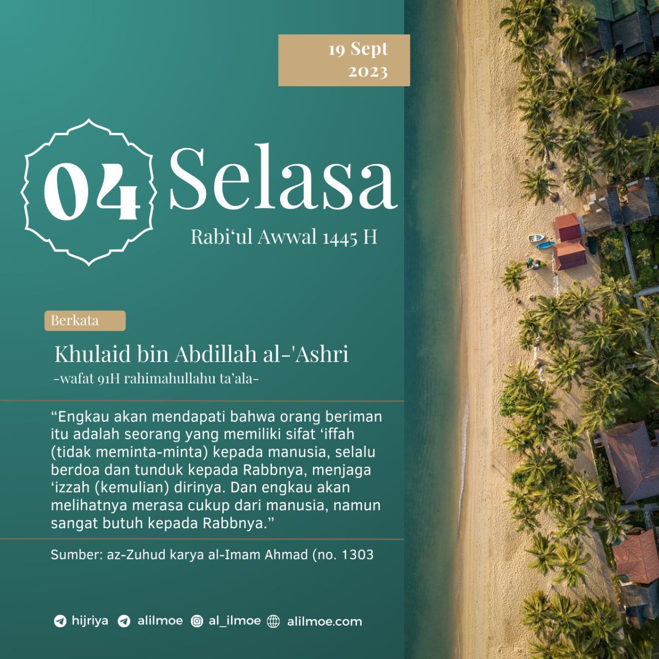 Khulaid bin Abdillah al-Ashari (91H) rahimahullahu ta’ala berkata, تَلْقَاهُ عَفِيفًا عَنِ النَّاسِ ، سَئُولًا لِرَبِّهِ عَزَّ وَجَلَّ ذَلِيلًا لِرَبِّهِ، عَزِيزًا […]