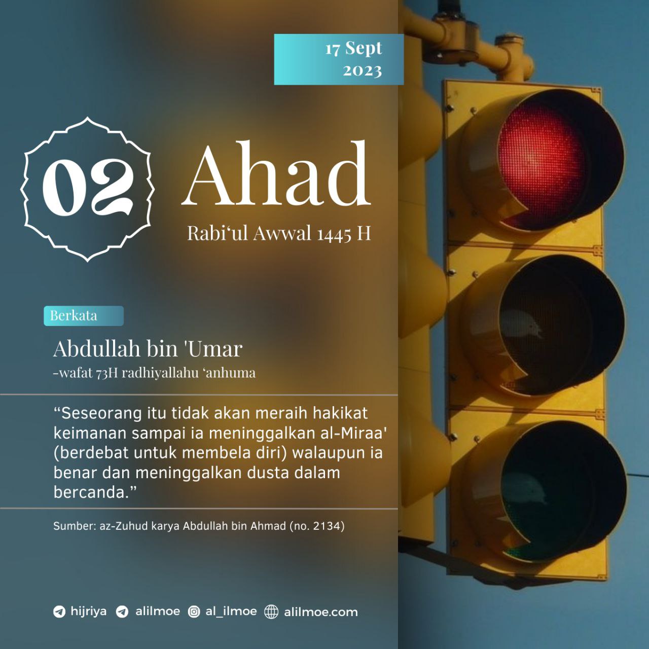 Abdullah bin ‘Umar radhiyallahu ‘anhuma -wafat 73H- berkata, لن يصيبَ رَجُلٌ حقيقةَ الإيمانِ حتَّى يترُكَ المِراءَ، وهو يعلَمُ أنَّه صادِقٌ، […]